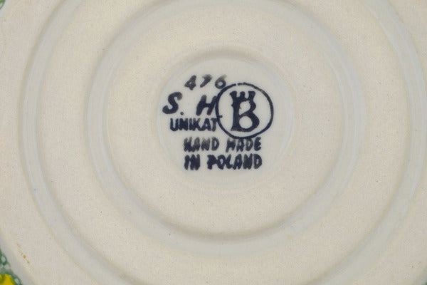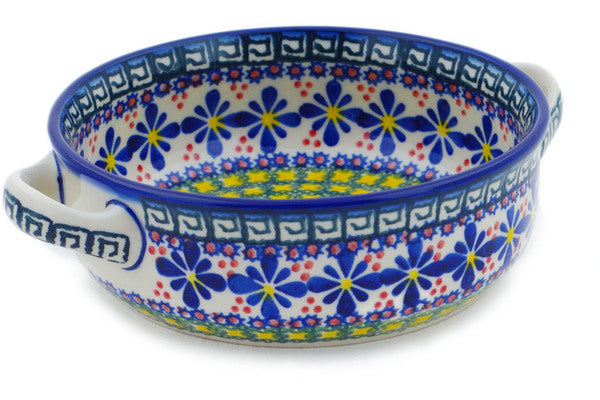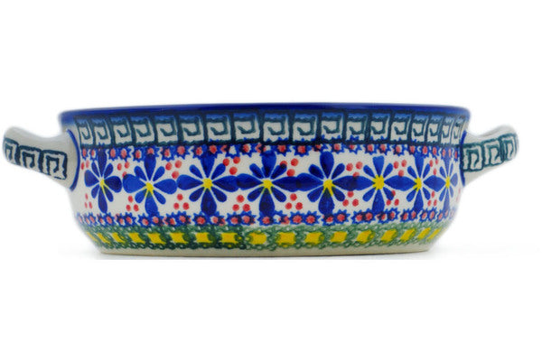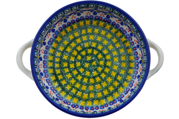 This Polish Pottery Round Baker with Handles is handmade and handpainted by the Ceramika Bona factory in Boleslawiec, Poland. Manufacturer item number H9274P. It is 2¼" high and measures 8" by 6½". The capacity of this Round Baker with Handles is 23.97 oz (brimful) and it weighs 1.1 lbs. It is part of the Irish Spring Collection.