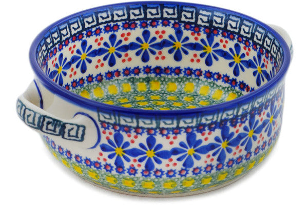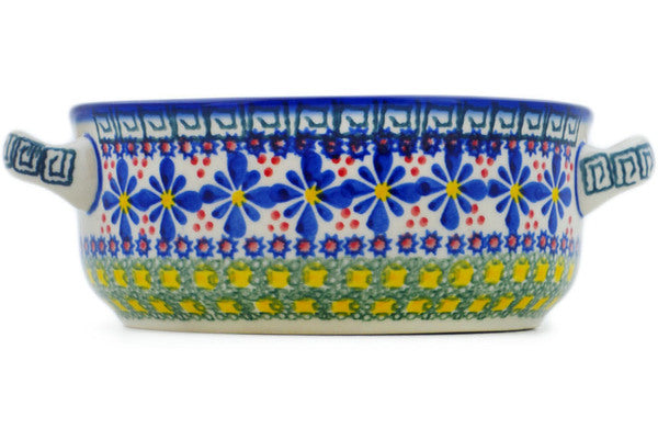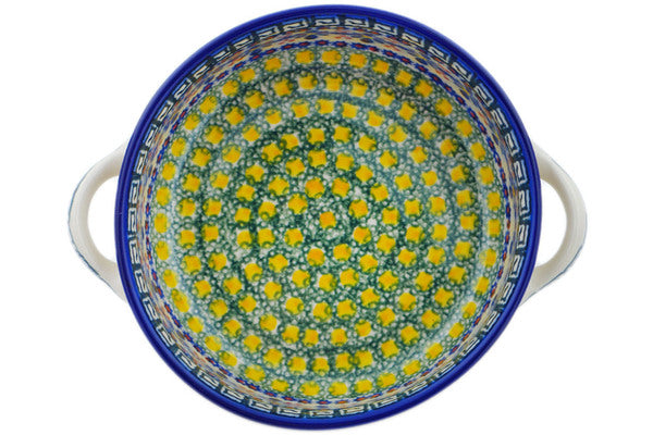 This Polish Pottery Round Baker with Handles is handmade and handpainted by the Ceramika Bona factory in Boleslawiec, Poland. Manufacturer item number H3045Q. It is 2¾" high and measures 8¼" by 6½". The capacity of this Round Baker with Handles is 30.77 oz (brimful) and it weighs 1.3 lbs. It is part of the Irish Spring Collection.