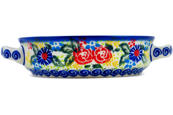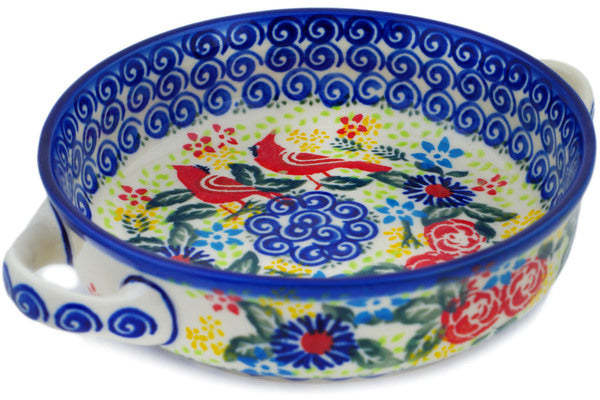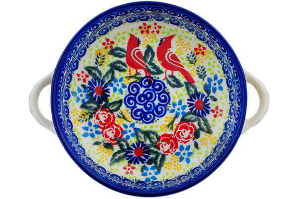 This Polish Pottery Round Baker with Handles is handmade and handpainted by the Ceramika Bona factory in Boleslawiec, Poland. Manufacturer item number H0946P. It is 1¾" high and measures 8¼" by 6½". The capacity of this Round Baker with Handles is 16.84 oz (brimful) and it weighs 1.0 lbs. It is part of the Lovely Red Birds Collection.