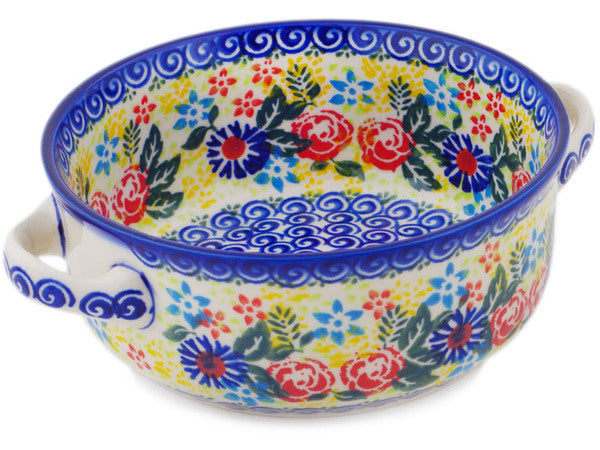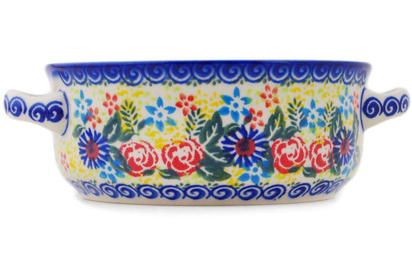 This Polish Pottery Round Baker with Handles is handmade and handpainted by the Ceramika Bona factory in Boleslawiec, Poland. Manufacturer item number H0996O. It is 2¾" high and measures 8¼" by 6½". The capacity of this Round Baker with Handles is 30.77 oz (brimful) and it weighs 1.3 lbs. It is part of the Lovely Red Birds Collection.