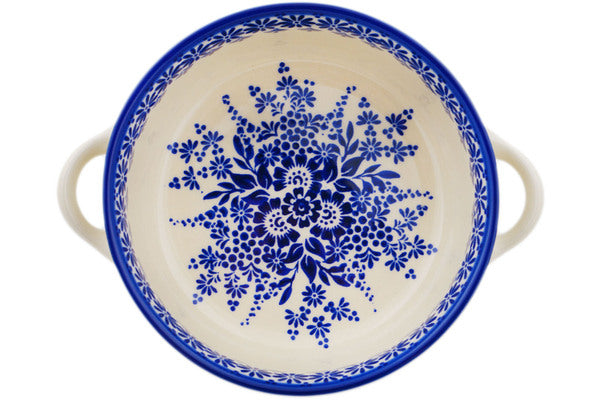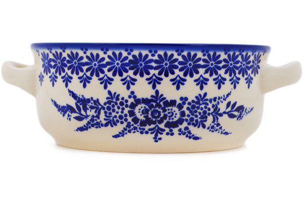 This Polish Pottery Round Baker with Handles is handmade and handpainted by the Stara Fabryka factory in Boleslawiec, Poland. Manufacturer item number H9787N. It is 2¾" high and measures 8" by 6½". The capacity of this Round Baker with Handles is 29.62 oz (brimful) and it weighs 1.3 lbs. It is part of the Morning Frost Collection.