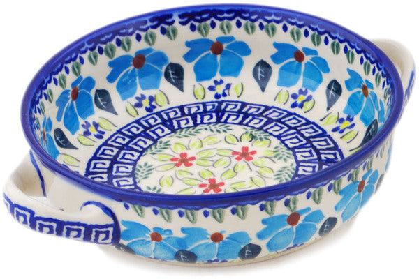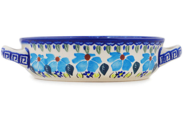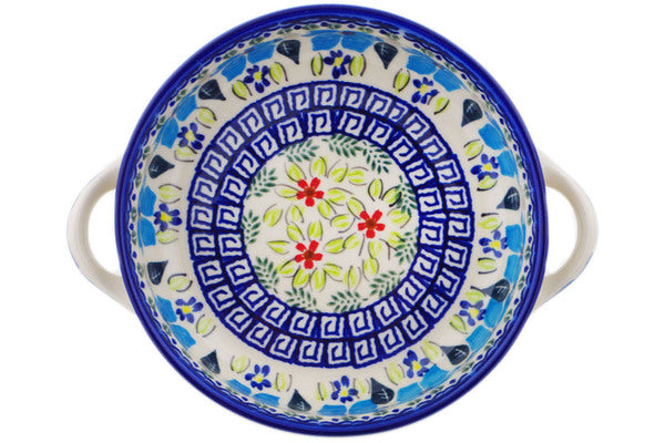 This Polish Pottery Round Baker with Handles is handmade and handpainted by the Ceramika Bona factory in Boleslawiec, Poland. Manufacturer item number H7618P. It is 1¾" high and measures 8¼" by 6½". The capacity of this Round Baker with Handles is 16.84 oz (brimful) and it weighs 1.0 lbs. It is part of the Pansy Morning Collection.