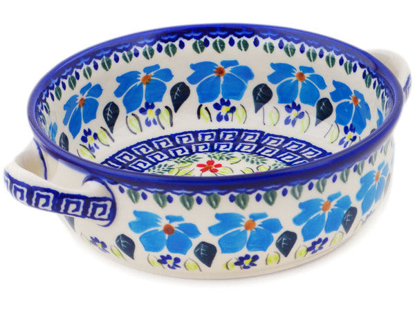 This Polish Pottery Round Baker with Handles is handmade and handpainted by the Ceramika Bona factory in Boleslawiec, Poland. Manufacturer item number H7619P. It is 2¼" high and measures 8" by 6½". The capacity of this Round Baker with Handles is 23.97 oz (brimful) and it weighs 1.1 lbs. It is part of the Pansy Morning Collection.