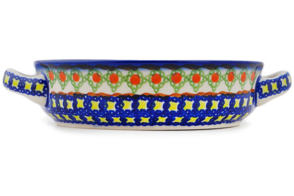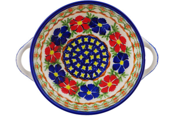 This Polish Pottery Round Baker with Handles is handmade and handpainted by the Ceramika Bona factory in Boleslawiec, Poland. Manufacturer item number H1853Q. It is 1¾" high and measures 8¼" by 6½". The capacity of this Round Baker with Handles is 16.84 oz (brimful) and it weighs 1.0 lbs. It is part of the Paradise Poppy Collection.
