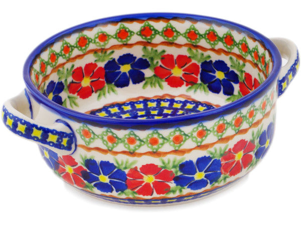 This Polish Pottery Round Baker with Handles is handmade and handpainted by the Ceramika Bona factory in Boleslawiec, Poland. Manufacturer item number H1851Q. It is 2¾" high and measures 8¼" by 6½". The capacity of this Round Baker with Handles is 30.77 oz (brimful) and it weighs 1.3 lbs. It is part of the Paradise Poppy Collection.