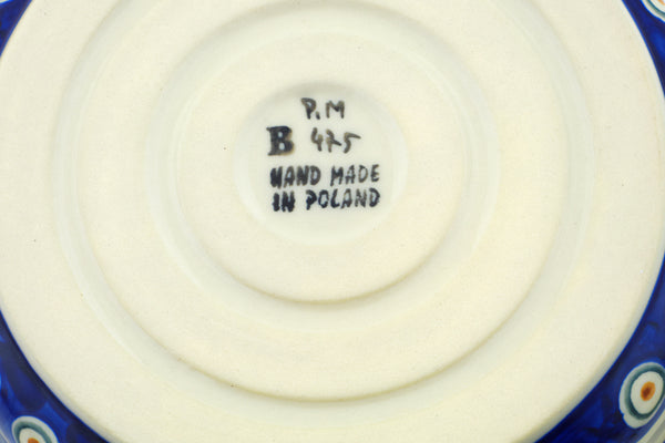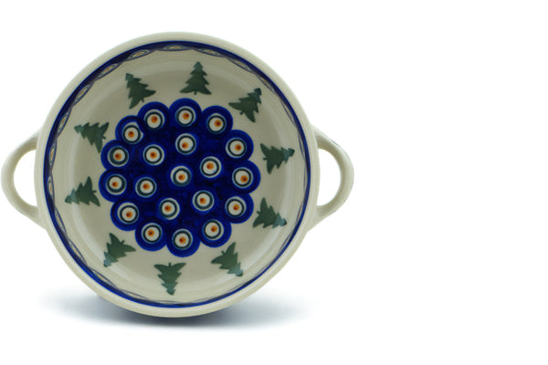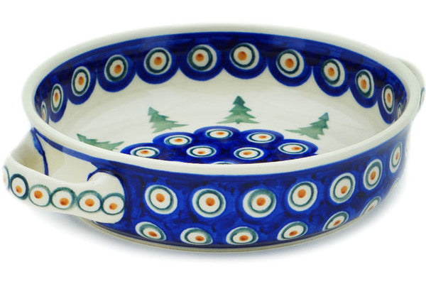 This Polish Pottery Round Baker with Handles is handmade and handpainted by the Ceramika Bona factory in Boleslawiec, Poland. Manufacturer item number H0274N. It is 1¾" high and measures 8¼" by 6½". The capacity of this Round Baker with Handles is 16.84 oz (brimful) and it weighs 1.0 lbs. It is part of the Peacock Pines Collection.