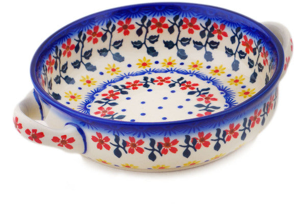 This Polish Pottery Round Baker with Handles is handmade and handpainted by the Ceramika Bona factory in Boleslawiec, Poland. Manufacturer item number H4168Q. It is 1¾" high and measures 8¼" by 6½". The capacity of this Round Baker with Handles is 16.84 oz (brimful) and it weighs 1.0 lbs. It is part of the Red Sunflower Collection.