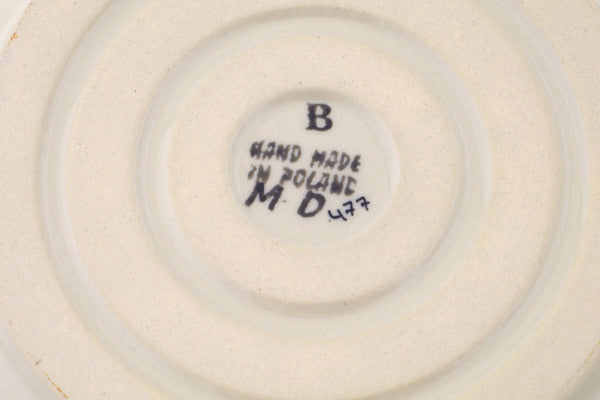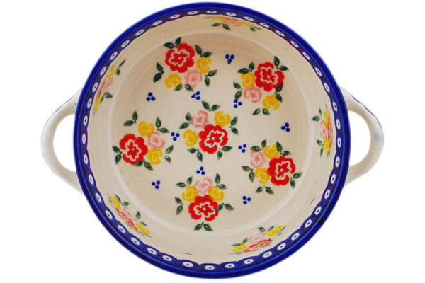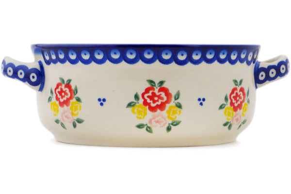 This Polish Pottery Round Baker with Handles is handmade and handpainted by the Ceramika Bona factory in Boleslawiec, Poland. Manufacturer item number H0453P. It is 2¾" high and measures 8¼" by 6½". The capacity of this Round Baker with Handles is 30.77 oz (brimful) and it weighs 1.3 lbs. It is part of the Sunny Side Blooms Collection.