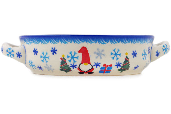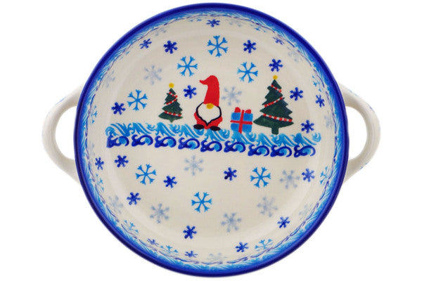 This Polish Pottery Round Baker with Handles is handmade and handpainted by the Ceramika Bona factory in Boleslawiec, Poland. Manufacturer item number H9027P. It is 1¾" high and measures 8¼" by 6½". The capacity of this Round Baker with Handles is 16.84 oz (brimful) and it weighs 1.0 lbs. It is part of the Winter Gnome Collection.