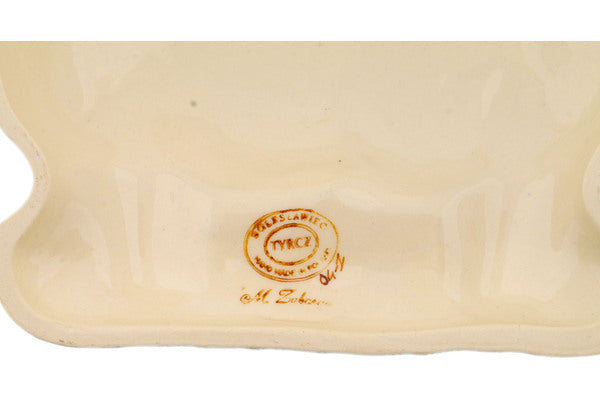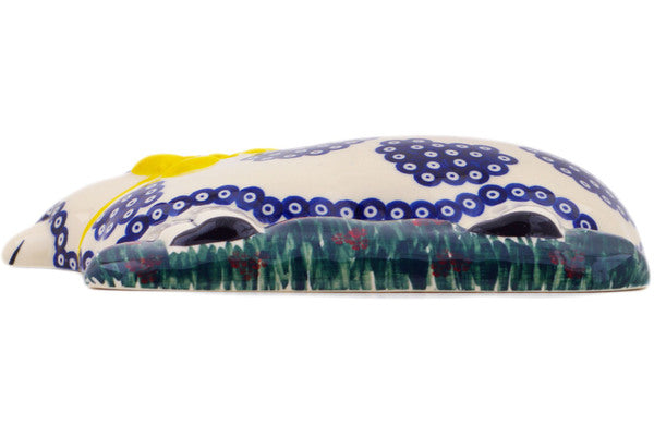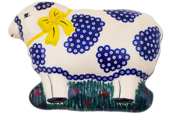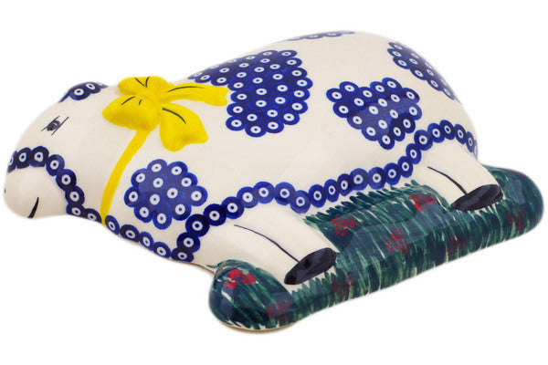 This Polish Pottery Sheep Figurine is handmade and handpainted by the Tyrcz factory in Boleslawiec, Poland. Manufacturer item number H0719N. It is 1¾" high and measures 8¼" by 5½". The weight of this Sheep Figurine is 1.6 lbs. It is part of the Peacock Feather Collection.