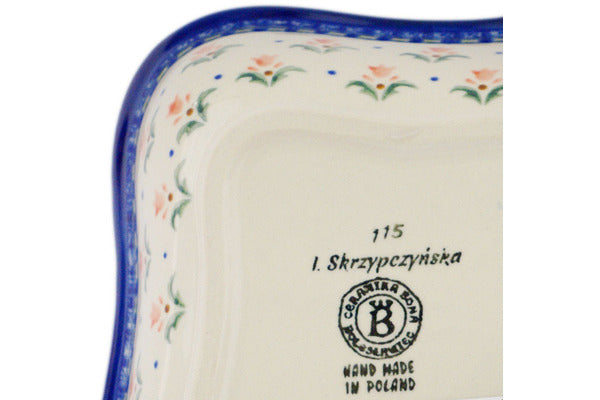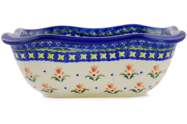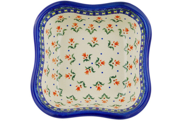 This Polish Pottery Square Bowl is handmade and handpainted by the Ceramika Bona factory in Boleslawiec, Poland. Manufacturer item number H5463R. It is 3" high and measures 8¼" by 8¼". The capacity of this Square Bowl is 42.61 oz (brimful) and it weighs 1.9 lbs. It is part of the Cocentric Tulips Collection.