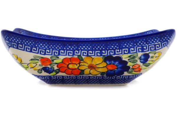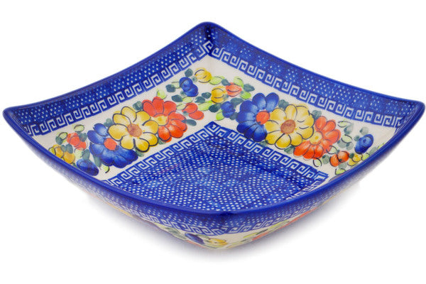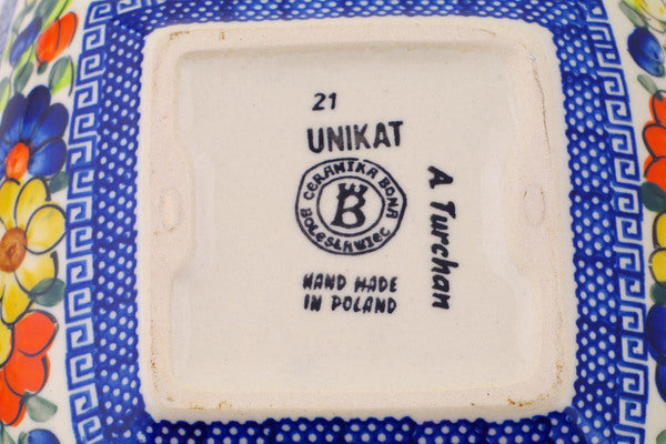 This Polish Pottery Square Bowl is handmade and handpainted by the Ceramika Bona factory in Boleslawiec, Poland. Manufacturer item number H3939Q. It is 2½" high and measures 7¾" by 7¾". The capacity of this Square Bowl is 34.36 oz (brimful) and it weighs 1.8 lbs. It is part of the Fall Garden Collection.