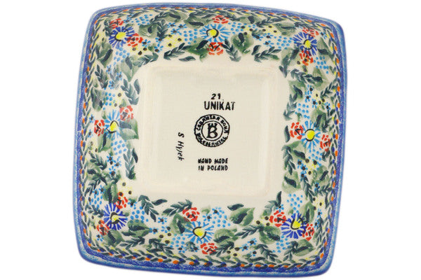 This is a Polish pottery Unikat (Signature) Square Bowl, which means that it has been hand painted with both sponges and brushes and it is signed by the artist who painted it. Unikat pieces are the most intricate works of art. Larger Unikat items take hours of very careful work to finish.