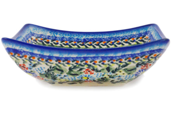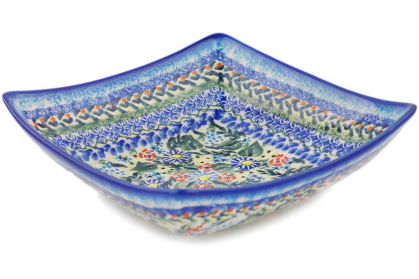 This Polish Pottery Square Bowl is handmade and handpainted by the Ceramika Bona factory in Boleslawiec, Poland. Manufacturer item number H9322F. It is 2½" high and measures 7¾" by 7¾". The capacity of this Square Bowl is 34.36 oz (brimful) and it weighs 1.8 lbs. It is part of the Flor-De-Lis Collection.