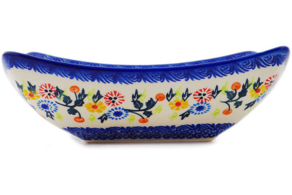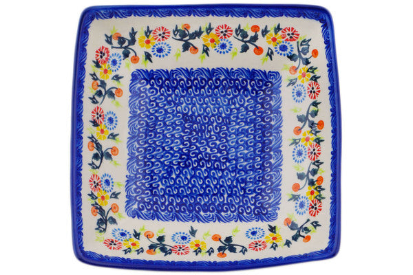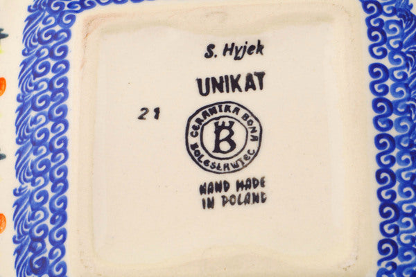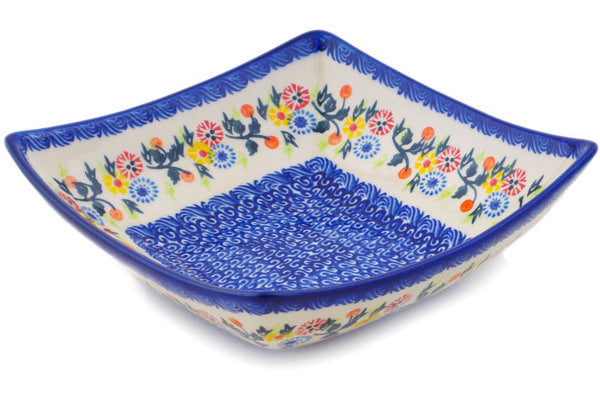 This Polish Pottery Square Bowl is handmade and handpainted by the Ceramika Bona factory in Boleslawiec, Poland. Manufacturer item number H1913R. It is 2½" high and measures 7¾" by 7¾". The capacity of this Square Bowl is 34.36 oz (brimful) and it weighs 1.8 lbs. It is part of the Pastel Spring Wreath Collection.