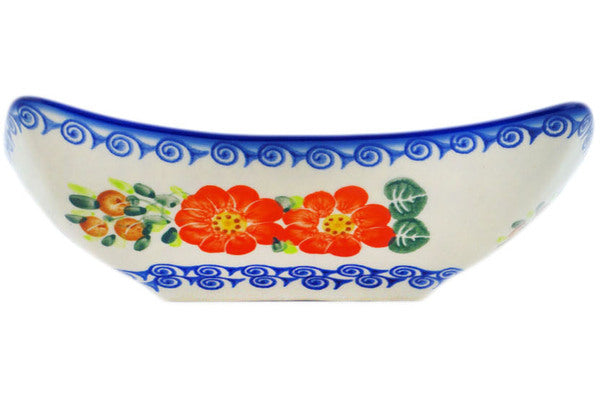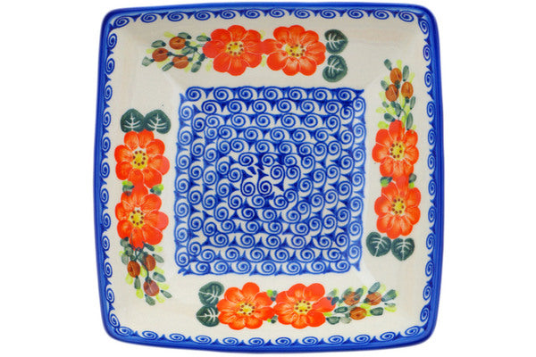 This Polish Pottery Square Bowl is handmade and handpainted by the Ceramika Bona factory in Boleslawiec, Poland. Manufacturer item number H9092P. It is 2½" high and measures 7¾" by 7¾". The capacity of this Square Bowl is 34.36 oz (brimful) and it weighs 1.8 lbs. It is part of the Red Blossom Collection.