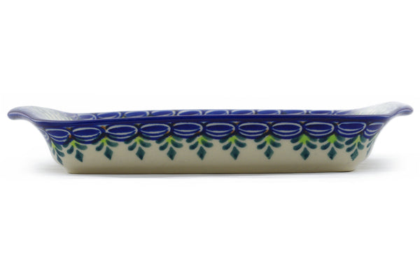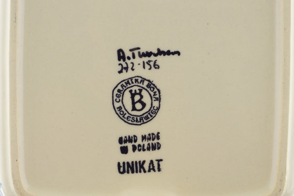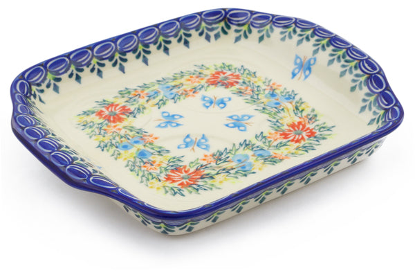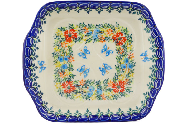 This Polish Pottery Tray with Handles is handmade and handpainted by the Ceramika Bona factory in Boleslawiec, Poland. Manufacturer item number H9994I. It is 1" high and measures 7¾" by 6¾". The capacity of this Tray with Handles is 8.93 oz (brimful) and it weighs 1.1 lbs. It is part of the Ring Of Flowers Collection.