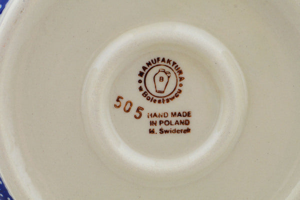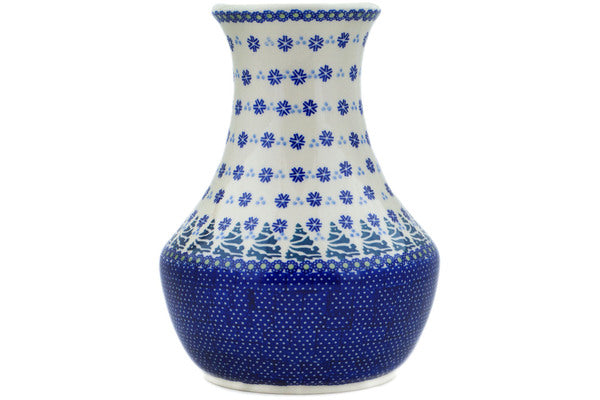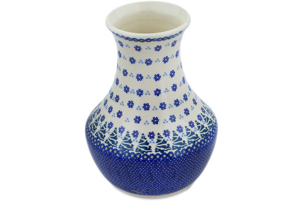 This Polish Pottery Vase is handmade and handpainted by the Manufaktura factory in Boleslawiec, Poland. Manufacturer item number H1315O. It is 8¼" high and measures 5¾" by 2¾". The capacity of this Vase is 101.41 oz (brimful) and it weighs 3.4 lbs. It is part of the Falling Snowflakes Collection.