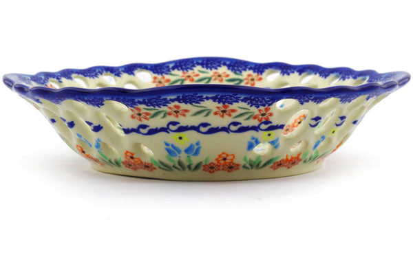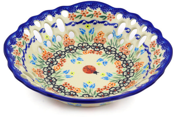 This Polish Pottery Bowl with Holes is handmade and handpainted by the Ceramika Bona factory in Boleslawiec, Poland. Manufacturer item number H0624F. It is 2" high and measures 9" by 9". The capacity of this Bowl with Holes is 2.23 oz (brimful) and it weighs 1.1 lbs. It is part of the Fanciful Ladybug Collection.