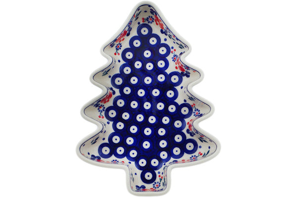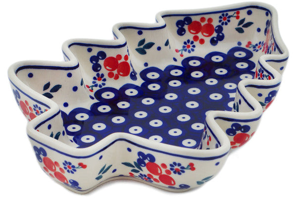 This Polish Pottery Christmas Tree Bowl is handmade and handpainted by the Manufaktura factory in Boleslawiec, Poland. Manufacturer item number H6510O. It is 1¾" high and measures 9½" by 7". The weight of this Christmas Tree Bowl is 1.3 lbs. It is part of the Burst Of Berries Collection.