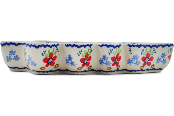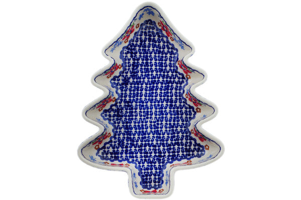 This Polish Pottery Christmas Tree Bowl is handmade and handpainted by the Manufaktura factory in Boleslawiec, Poland. Manufacturer item number H6575O. It is 1¾" high and measures 9½" by 7". The weight of this Christmas Tree Bowl is 1.3 lbs. It is part of the Red Flower Meadow Collection.
