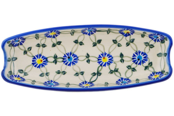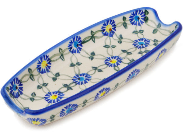 This Polish Pottery Corn Tray is handmade and handpainted by the Ceramika Bona factory in Boleslawiec, Poland. Manufacturer item number H1918R. It is 1½" high and measures 9¼" by 3½". The weight of this Corn Tray is 0.9 lbs. It is part of the Blue Thistle Beauty Collection.