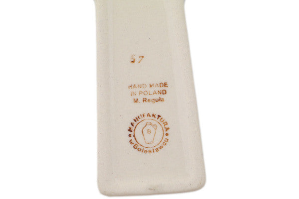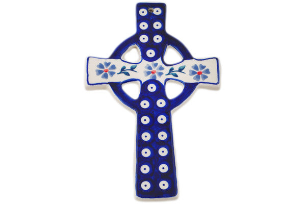 This Polish Pottery Cross is handmade and handpainted by the Manufaktura factory in Boleslawiec, Poland. Manufacturer item number H7062O. It is ¼" high and measures 9" by 5¾". The weight of this Cross is 0.5 lbs. It is part of the Peacock Forget-Me-Not Collection.