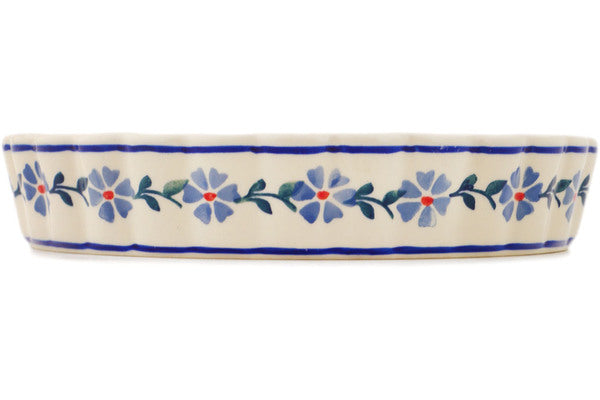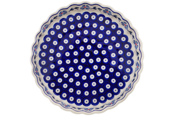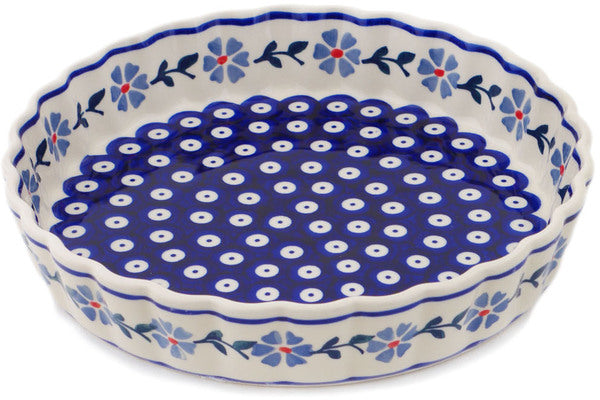 This Polish Pottery Fluted Pie Dish is handmade and handpainted by the Manufaktura factory in Boleslawiec, Poland. Manufacturer item number H6981O. It is 1¾" high and measures 9½" by 9½". The weight of this Fluted Pie Dish is 1.9 lbs. It is part of the Peacock Forget-Me-Not Collection.