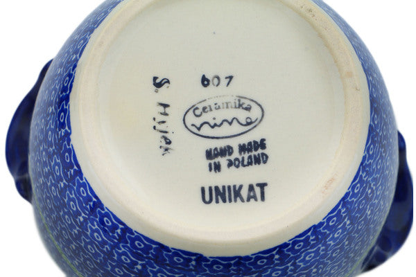 This is a Polish pottery Unikat (Signature) Jar with Lid and Handles, which means that it has been hand painted with both sponges and brushes and it is signed by the artist who painted it. Unikat pieces are the most intricate works of art. Larger Unikat items take hours of very careful work to finish.
