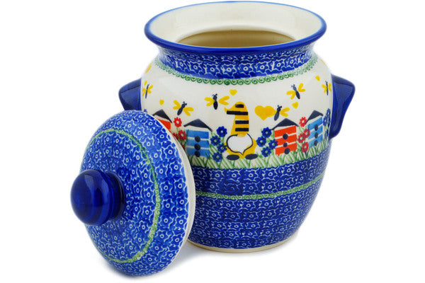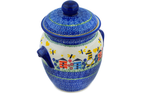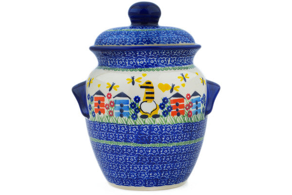 This Polish Pottery Jar with Lid and Handles is handmade and handpainted by the Ceramika Nina factory in Boleslawiec, Poland. Manufacturer item number H1650P. It is 8¾" high and measures 7¼" by 6". The capacity of this Jar with Lid and Handles is 63.13 oz (brimful) and it weighs 3.6 lbs. It is part of the Beekeeper Gnome Collection.