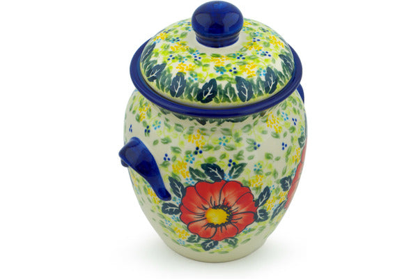 This Polish Pottery Jar with Lid and Handles is handmade and handpainted by the Ceramika Nina factory in Boleslawiec, Poland. Manufacturer item number H0644P. It is 8¾" high and measures 7¼" by 6". The capacity of this Jar with Lid and Handles is 63.13 oz (brimful) and it weighs 3.6 lbs. It is part of the Bloom Tales Collection.
