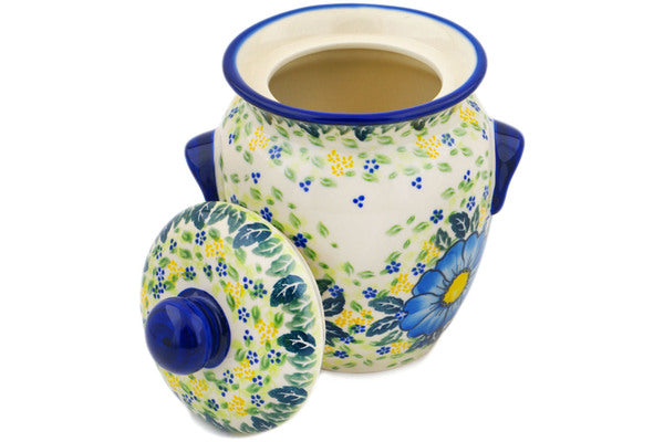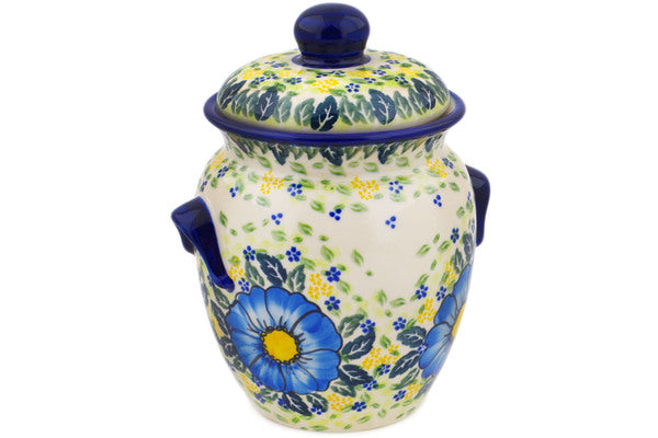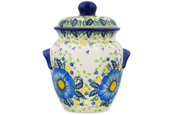 This Polish Pottery Jar with Lid and Handles is handmade and handpainted by the Ceramika Nina factory in Boleslawiec, Poland. Manufacturer item number H1174P. It is 8¾" high and measures 7¼" by 6". The capacity of this Jar with Lid and Handles is 63.13 oz (brimful) and it weighs 3.6 lbs. It is part of the Blue Happy Fields Collection.