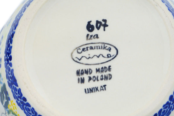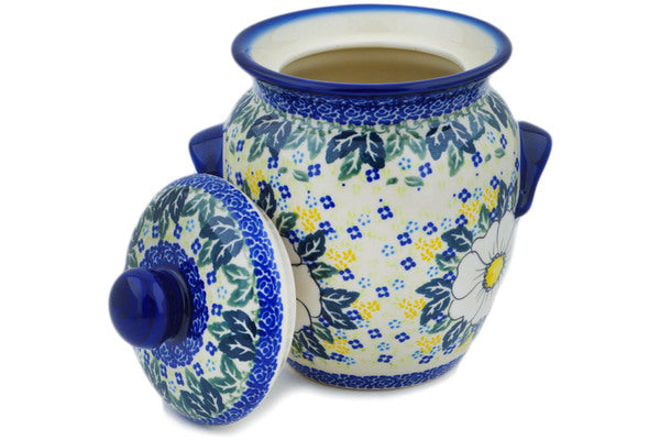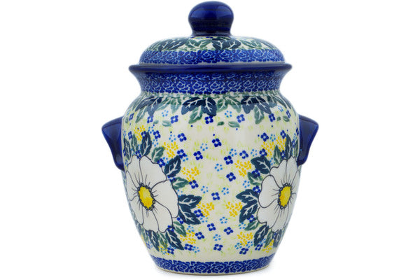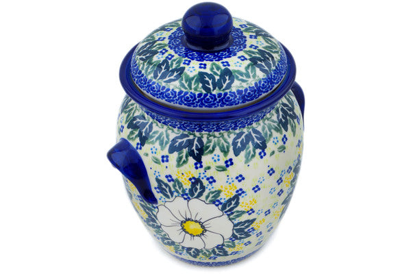 This Polish Pottery Jar with Lid and Handles is handmade and handpainted by the Ceramika Nina factory in Boleslawiec, Poland. Manufacturer item number H1989P. It is 8¾" high and measures 7¼" by 6". The capacity of this Jar with Lid and Handles is 63.13 oz (brimful) and it weighs 3.6 lbs. It is part of the Floral Fantasy Collection.