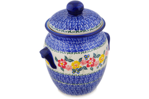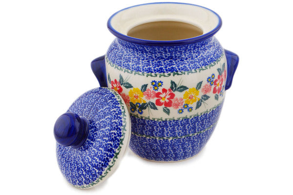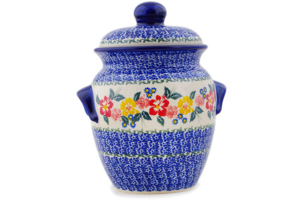 This Polish Pottery Jar with Lid and Handles is handmade and handpainted by the Ceramika Bona factory in Boleslawiec, Poland. Manufacturer item number H1731P. It is 8¾" high and measures 7¼" by 6". The capacity of this Jar with Lid and Handles is 63.13 oz (brimful) and it weighs 3.6 lbs. It is part of the Hibiscus Haven Collection.