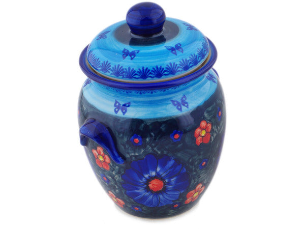 This Polish Pottery Jar with Lid and Handles is handmade and handpainted by the Ceramika Bona factory in Boleslawiec, Poland. Manufacturer item number H0209Q. It is 8¾" high and measures 7¼" by 6". The capacity of this Jar with Lid and Handles is 63.13 oz (brimful) and it weighs 3.6 lbs. It is part of the Midnight Garden Collection.