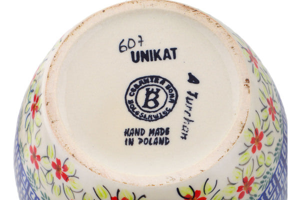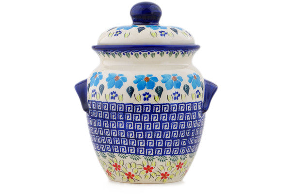 This Polish Pottery Jar with Lid and Handles is handmade and handpainted by the Ceramika Bona factory in Boleslawiec, Poland. Manufacturer item number H9968O. It is 8¾" high and measures 7¼" by 6". The capacity of this Jar with Lid and Handles is 63.13 oz (brimful) and it weighs 3.6 lbs. It is part of the Pansy Morning Collection.