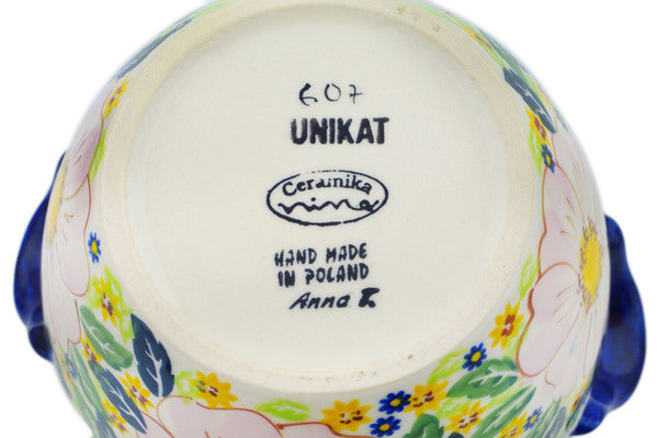 This is a Polish pottery Unikat (Signature) Jar with Lid and Handles, which means that it has been hand painted with both sponges and brushes and it is signed by the artist who painted it. Unikat pieces are the most intricate works of art. Larger Unikat items take hours of very careful work to finish.