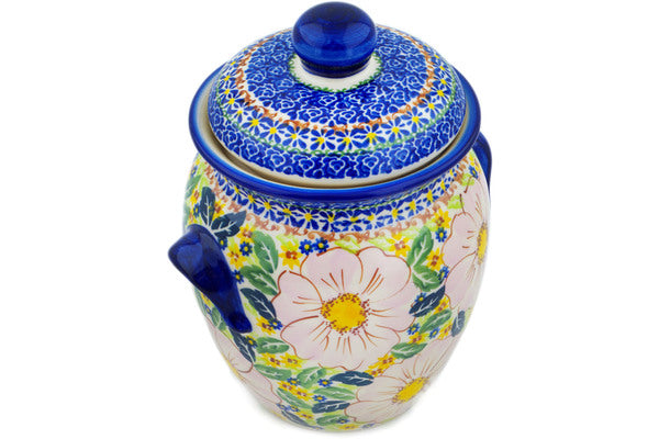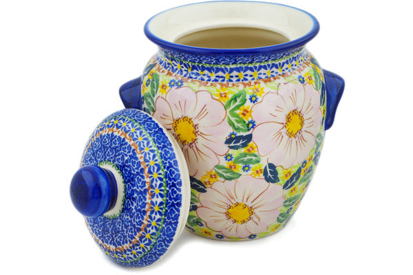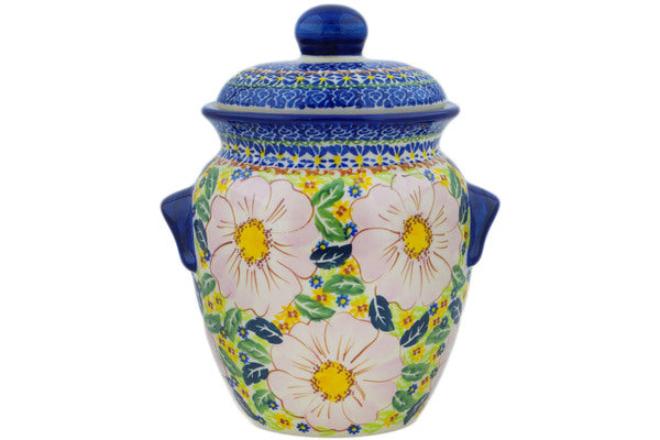 This Polish Pottery Jar with Lid and Handles is handmade and handpainted by the Ceramika Nina factory in Boleslawiec, Poland. Manufacturer item number H3317P. It is 8¾" high and measures 7¼" by 6". The capacity of this Jar with Lid and Handles is 63.13 oz (brimful) and it weighs 3.6 lbs. It is part of the Pink Delight Collection.