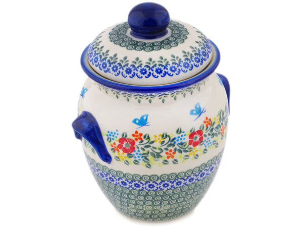 This Polish Pottery Jar with Lid and Handles is handmade and handpainted by the Ceramika Bona factory in Boleslawiec, Poland. Manufacturer item number H0205Q. It is 8¾" high and measures 7¼" by 6". The capacity of this Jar with Lid and Handles is 63.13 oz (brimful) and it weighs 3.6 lbs. It is part of the Ring Of Meadow Flowers Collection.