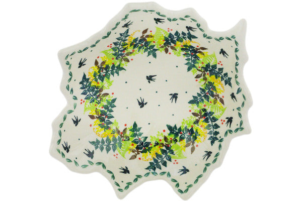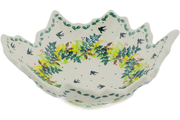 This Polish Pottery Leaf Shaped Bowl is handmade and handpainted by the Dalia factory in Boleslawiec, Poland. Manufacturer item number H1478R. It is 3¼" high and measures 9¼" by 7¾". The capacity of this Leaf Shaped Bowl is 11.56 oz (brimful) and it weighs 1.5 lbs. It is part of the Sunny Swallow Collection.