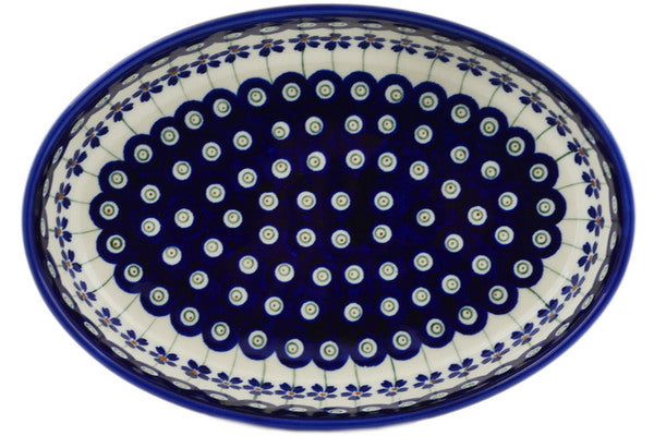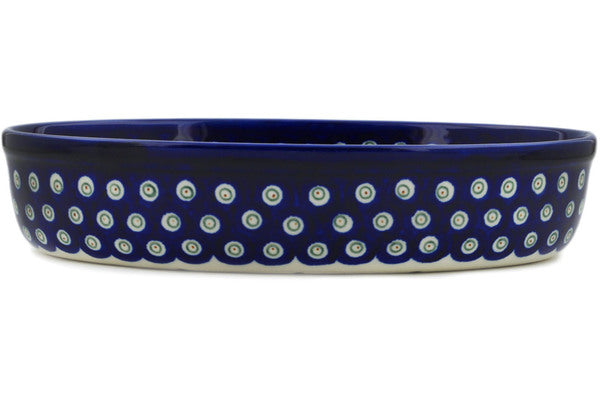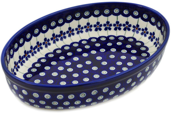 This Polish Pottery Oval Baker is handmade and handpainted by the Zaklady Ceramiczne factory in Boleslawiec, Poland. Manufacturer item number H4956L. It is 2" high and measures 9½" by 6¾". The capacity of this Oval Baker is 34.39 oz (brimful) and it weighs 1.4 lbs. It is part of the Flowering Peacock Collection.