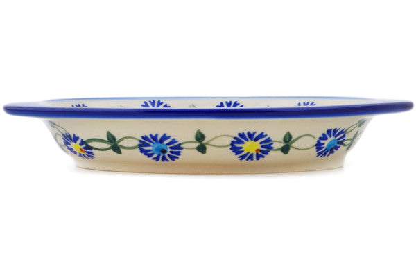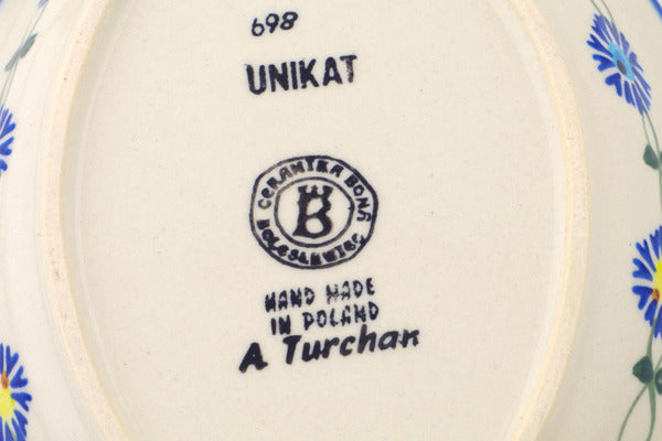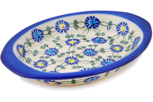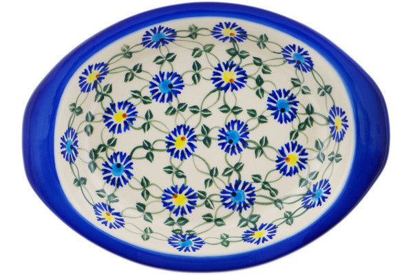 This Polish Pottery Oval Platter is handmade and handpainted by the Ceramika Bona factory in Boleslawiec, Poland. Manufacturer item number H2222R. It is 1½" high and measures 9" by 6¾". The capacity of this Oval Platter is 12.51 oz (brimful) and it weighs 1.1 lbs. It is part of the Blue Thistle Beauty Collection.
