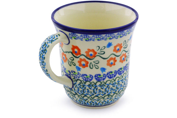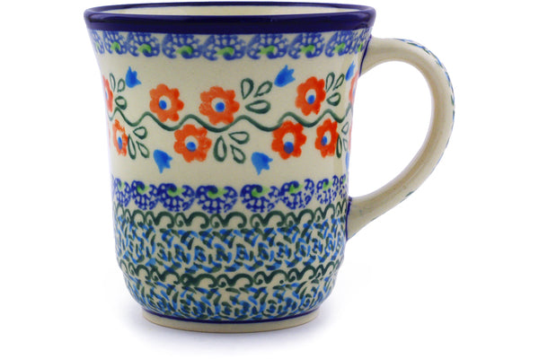 This Polish Pottery Mug is handmade and handpainted by the Zaklady Ceramiczne factory in Boleslawiec, Poland. Manufacturer item number H8041I. It is 4" high and measures 4¾" by 3¾". The capacity of this Mug is 10.01 oz (brimful) and it weighs 0.8 lbs. It is part of the Tulip Vines Collection.