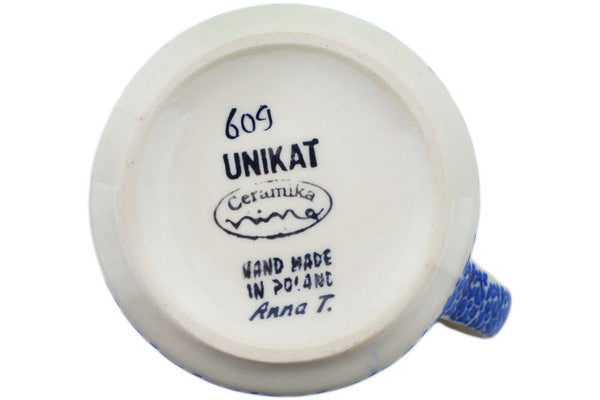 This is a Polish pottery Unikat (Signature) Pitcher, which means that it has been hand painted with both sponges and brushes and it is signed by the artist who painted it. Unikat pieces are the most intricate works of art. Larger Unikat items take hours of very careful work to finish.