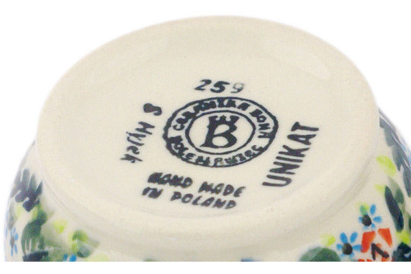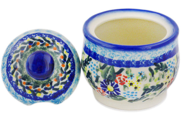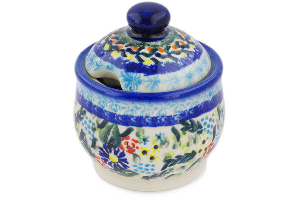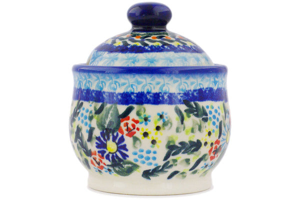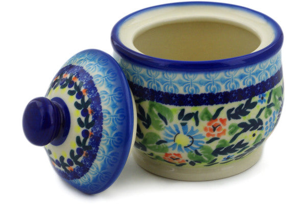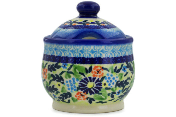 This Polish Pottery Sugar Bowl is handmade and handpainted by the Ceramika Bona factory in Boleslawiec, Poland. Manufacturer item number H5199K. It is 4½" high and measures 3¾" by 3¾". The capacity of this Sugar Bowl is 9.20 oz (brimful) and it weighs 0.9 lbs. It is part of the Flor-De-Lis Collection.