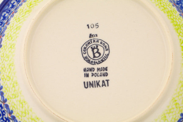This Polish Pottery Pasta Bowl is handmade and handpainted by the Ceramika Bona factory in Boleslawiec, Poland. Manufacturer item number H8714Q. It is 1½" high and measures 9" by 9". The capacity of this Pasta Bowl is 23.67 oz (brimful) and it weighs 1.4 lbs. It is part of the Metamorphosis Collection.