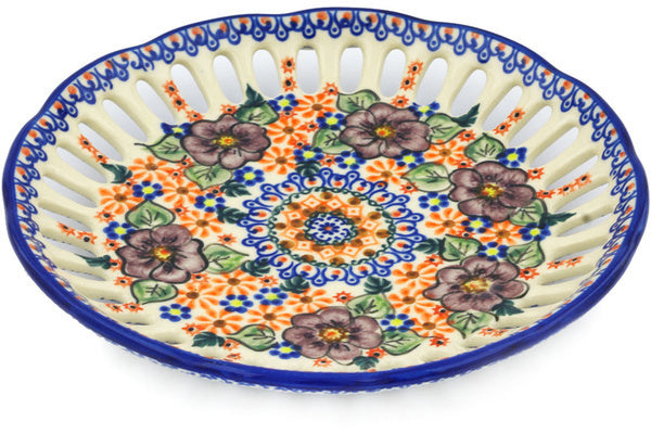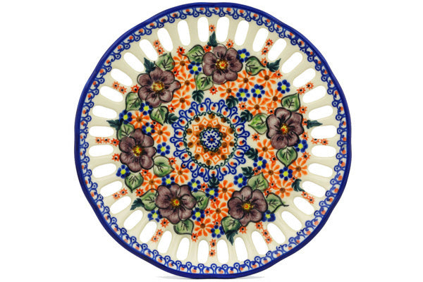 This Polish Pottery Plate with Holes is handmade and handpainted by the Ceramika Bona factory in Boleslawiec, Poland. Manufacturer item number H0480H. It is 1½" high and measures 9¼" by 9¼". The weight of this Plate with Holes is 1.5 lbs. It is part of the Mauve Poppies Collection.