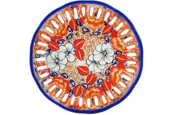 This Polish Pottery Plate with Holes is handmade and handpainted by the Ceramika Bona factory in Boleslawiec, Poland. Manufacturer item number H5961R. It is 1½" high and measures 9¼" by 9¼". The weight of this Plate with Holes is 1.5 lbs. It is part of the Poppy Passion Collection.