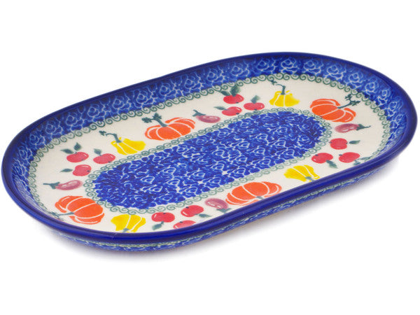 This Polish Pottery Platter is handmade and handpainted by the Ceramika Bona factory in Boleslawiec, Poland. Manufacturer item number H1741P. It is 1" high and measures 9" by 5¾". The weight of this Platter is 0.8 lbs. It is part of the Fresh Vegetable Garden Collection.