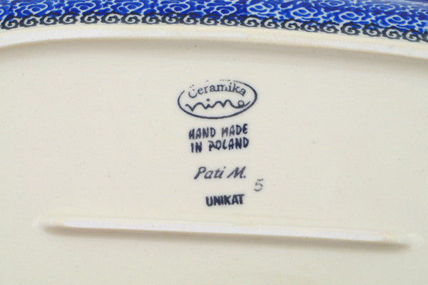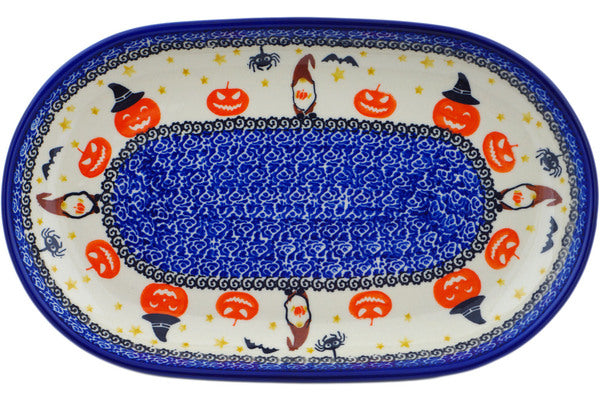 This Polish Pottery Platter is handmade and handpainted by the Ceramika Nina factory in Boleslawiec, Poland. Manufacturer item number H1358P. It is 1" high and measures 9" by 5¾". The weight of this Platter is 0.8 lbs. It is part of the Harvest Haunt Collection.